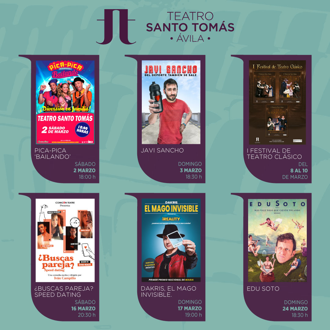 infantil, dos monólogos, un festival de teatro, una comedia teatral y un show de magia. La agrupación infantil Pica-Pica repetirá experiencia en el Teatro Santo Tomás abriendo la agenda cultural de marzo, el sábado 2, con su emblemático espectáculo ‘Bailando’. En esta ocasión, nuestro escenario acogerá las fiestas del pueblo de Belén, Nacho y Emi. Desde las seis de la tarde, aprenderemos todos los juegos que hay en una feria y no pararemos de mover el esqueleto al ritmo de nuevos temas infantiles y algunos grandes éxitos de los 80 como ‘Tómbola’, ‘La Mané’ o ‘El baile de la fruta’, entre otros. Las visitas del trío Pica-Pica a Ávila son sinónimo de diversión en familia.